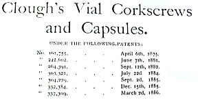 1885 December 15 U.S. Patent No. 332,382, "Capsule for Bottles" (Capsule Cork Remover) This capsule could be used for advertising and had integral teeth to facilitate cork removal. An 1886 advertisement for the Clough Corkscrew & Capsule Co. and an 1892 Clough & Maconnell price list illustrated his patent vial capsules, but to our knowledge no example of this capsule has been found. ![]() |