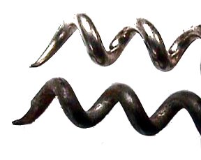 A ground point shown above a scarf cut wire helix point. All Clough's previous patents manufactured by Williamson, with the more expensive ground/sharpened point, could now be manufactured by Clough with this less expensive type of scarf point. It is logical to assume that any wire corkscrew found with a scarf cut point, would have been made after this 1886 patent date. |