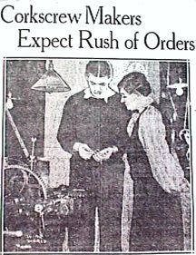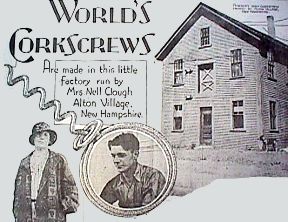 A piece in The Worcester Telegram of Sunday August 28,1932, claimed that 90% of the worlds' corkscrews were manufactured by 'The Corkscrew Lady-Mrs. Nell Clough'. According to this paper, the world was once more clamoring for corkscrews. A photograph shows Nell Clough and son William Rockwell Jr. referring to them as the Superintendents of America's only factory devoted exclusively to the manufacture of corkscrews. Note that William's head is pictured inside a 1900 patent corkscrew finger ring, with the modest sized Clough factory on the right. The Alton factory made more than 30,000,000 corkscrews that year, utilizing 17 corkscrew manufacturing machines several of which turned out 1000 per hour. |