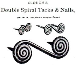 December 14, 1880, U.S. Patent No. 235,515 Spiral Wire Hooks and Tacks. Clough began manufacture of his spiral wire headed tacks in his plant at New Jersey Railroad Avenue & Hamilton Street, Newark, New Jersey. Clough sold the rights to this patent to C.T. Williamson who published a "SUPPLEMENTARY CATALOGUE AND PRICE LIST" on September 1, 1883 containing a full description and illustrations of Clough's Patented spiral hooks, nails tacks etc. A selection of these spiral tacks are at the New Hampshire Historical Society in Concord. In addition Clough Manufacturing Co. published on July 1, 1882 a Catalogue & Price list of Spiral Hooks, Nails & Tacks including the December 14, 1880 Spiral Tack |