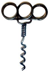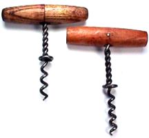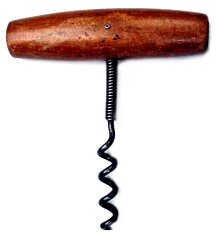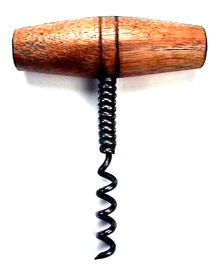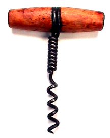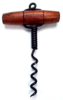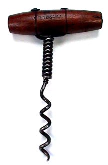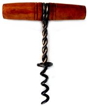 A 20th century German corkscrew influenced by Clough. It is simply a piece of twisted wire pinned in position off centre in a wood handle. The shaft is wrapped tightly with a lighter gauge wire to provide some improved rigidity and adds a decorative pattern to an otherwise stark corkscrew. |