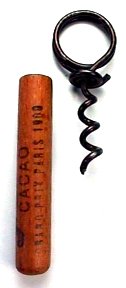 ![]() A rather poorly fabricated Clough finger corkscrew based on his 1890/1900 patent, but with a square cut off button, definitely not made by a Clough machine. The wood sheath advertises a Swiss chocolate firm Suchard CACO CHOCOLAT GRAND PRIX PARIS 1900. Clough exhibited and won awards for his corkscrew manufacturing machine at the Paris Exposition of 1900. A wonderful 1900 patent corkscrew marked "Souvenir de L. Exposition, Paris 1900, Section Americaine, Salle Des Machines, Rockwell, Clough Co. Alton, New Hampshire, U.S.A. Machines, Automatiques, Brevetees, Breve! recently surfaced on Ebay. |