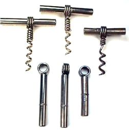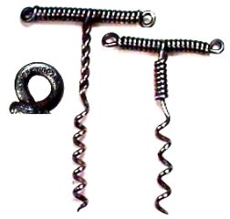 Wire T handle marked RD 50027 on a small handle end loop - British Registration No 50027, May 31, 1886 by W.T. Taylor Co. Ltd of Newhall Works, Birmingham. This corkscrew design made from a single piece of wire was registered by a English firm after the introduction of Clough wire corkscrews to Britain in 1878. The unmarked adjacent example has a slightly larger wire helix with one end of the wire wrapped around to form the shaft. This twisted wire handle design was never used in America and appears to be a unique English feature used with after the advent of the 1886 Taylor registration. |