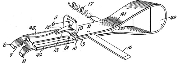 Our August 19 and September 9 issues featured some corkscrews combined with potato implements. Above is another potato peeler. This is Edward Arbansin's U. S. Patent No. 1,164,776 of December 21, 1915 for a "Can Opener". His combination tool includes a bottle cap remover, a nail or tack extractor, a can opener, a corkscrew, a Screw driver, and a cutting blade (15) "to be used in the capacity of a potato or fruit peeler." He fits a block of iron (20) into the handle so the tool can be used as a hammer.