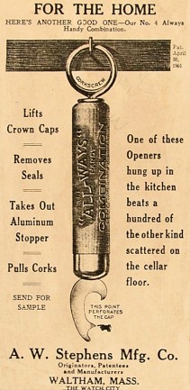 The extractor blade on the All-Ways performs three functions - it lifts crown caps, punctures the cap so that it cannot be reused (the intermediate point), and serves as a hook (the tip) for removing a bottle seal that has a loop in it (often termed a "patent" stopper). Baseler's 1901 patent, shown in Figure 7, was for a cap puncturing function and was assigned to the Augustus W. Stephens Mfg. Company of Cambridgeport, Massachusetts who manufactured the All-Ways tool.