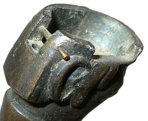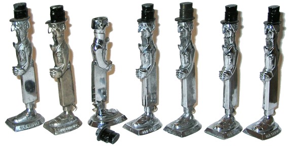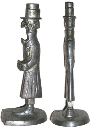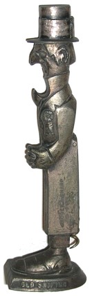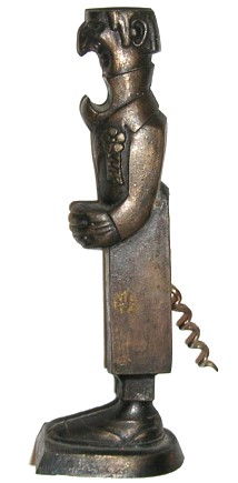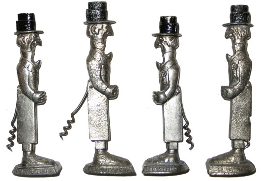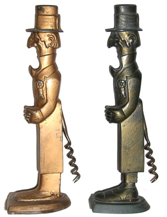 The rarest of the Kirby corkscrews is shown at right compared for size to the "standard" Old Snifter. It is solid bronze, unmarked and 180mm tall. Have you noted the significant differences from the other Demleys?....This one has two cap lifters and, suddenly, we find him carrying an UMBRELLA!