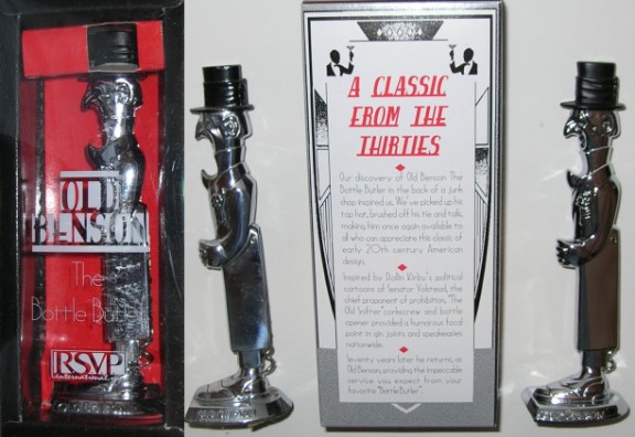"Old Benson" is an excellent reproduction of the Demley Old Snifter. It was made in Taiwan in 2000 and marketed by RSVP International, Seattle, Washington as "Old Benson, The Bottle Butler". It is marked "Old Benson" on the base. The package copy is "A Classic from the Thirties. Our Discovery of Old Benson The Bottle Butler in the back of a junk shop inspired us. We've picked up his top hat, brushed off his tie and tails, making him once again available to all who can appreciate this classic of early 20th century American design."