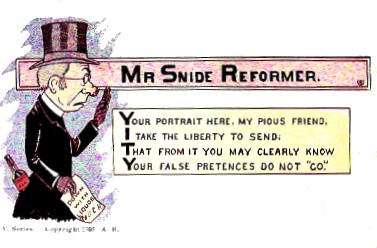 4. In "The Wrecking of the 18th Amendment" (1943, The Alcohol Information Press), Ernest Gordon writes "the novelist Dickens took a sharp dislike to them (English nonconformist ministers) and caricatured them at every opportunity. Stiggins...was one his creations... a man with threadbare black clothes, a prim-faced, red-nosed man with long thin countenance.... He carries the inevitable umbrella of the Englishman and wears the tall hat of the Abe Lincoln period."