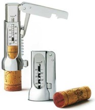 Editor's Note: Franmara describes this corkscrews with "This compact corkscrew is a unique extracting system. Place the unit over the bottle. Turn the entire unit clockwise to insert into the cork. The axis in the center rises to act as an indicator to tell you when the cork is fully inserted. Pull the 2-1/2" lever arm away from the body to activate an eleven-step ratchet and spring loaded arm to extract the cork. Works similar to a carjack. Teflon® coated spiral, stainless steel blade."