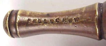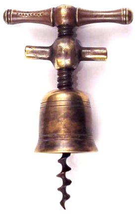 A flynut corkscrew marked BELLSCREW on one side of the handle and W G C on the other. Weights 13 ounces (365 grams). The handle width is 3 1/2". The diameter of the bottom of the bell is 1 5/8".