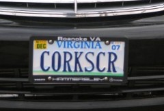 Wirtz, Virginia - In the April 9 issue, we asked readers to submit photos of their corkscrew related license plates. The old Bull Virginia license plate was CORKSCW. Son Michael Bull often asked "Dad, what's a Corks Cow? The current Bull Virginia license plate is CORKSCR.