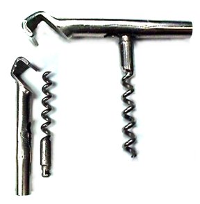 July 4, 2002, Ron MacLean writes: Here's a Russian corkscrew I found last Sunday morning. It is 2 5/8 inches long made of steel with the caplifter welded in place. The worm stores in the tube and locks in place in the tube with a slotted opening. The worm can fall out of the storage space if not careful.Don: The Russian picnic is a great find and interesting comparison to the corkscrew in my German cup / pourer / corkscrew set. The worm stores in the tube and is secured inside the pourer, then the four cups surround it and are placed in the fitted leather case. Each cup is marked MADE IN GERMANY U. S. ZONE. Here's a picture: