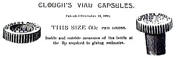 1885 December 15 U.S. Patent No. 332,382, "Capsule for Bottles" (Capsule Cork Remover) This capsule could be used for advertising and had integral teeth to facilitate cork removal. An 1886 advertisement for the Clough Corkscrew & Capsule Co. and an 1892 Clough & Maconnell price list illustrated his patent vial capsules, but to our knowledge no example of this capsule has been found. ![]() |