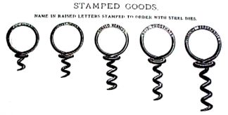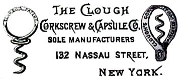 ![]() The 1892 Clough & Maconnell price list which illustrated his patent vial capsules also depicts wire corkscrews with the advertising stamped on the side of the finger ring and not on the top. a version that is not known to have been found. |