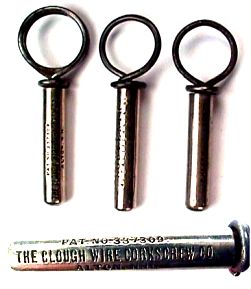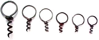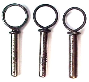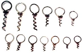 Single turn finger holes, with a scarf cut helix, were manufactured in a wide range of sizes (from 1 3/16"/2.6cm long to 2 7/8"/6.35cm), wire gauges and finishes. A few of the variety produced (but I am certain not all) are shown here. |