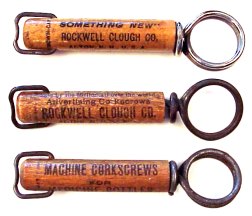 |  | The convenience of having a small Clough wire corkscrew handy is well illustrated in the May 19, 1903 Patent No. 728,735 granted to W.J. Lowenstein of Statesville, North Carolina for a Bottle Attachment - a recess in the glass under the label for holding a corkscrew or other tool. The patent design shows a Clough 1875 patent corkscrew with a metal advertising tag on the ring. It is not known but suspect that possibly Clough may have had some direct influence or input on the Lowenstein patent. | ||