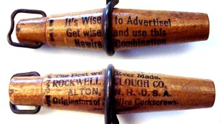 1910 March 1 U.S. Patent No. 950,509 Applied for October 17, 1907 "Bottle Cap Lifter" (Decapitator) Granted to Clough for decapitators similar to the English Patent 20,272 . Examples of this patent may often be found on sheaths with one variant called the "Newire Combination The Boss" on a handbill (below left) and shows the caplifter wire attachment fitted to one end of a wooden handle. An advertising model which W.R. Clough called "THE BOSS NEWIRE" with the handle (below right) almost completely covered with Clough advertising is marked It's Wise To Advertise! Get Wise And Use This NEWWIRE COMBINATION Corkscrew and Cap-Lifter / The Best We Ever Made / ROCKWELL CLOUGH CO. ALTON, N.H. U.S.A. / WRC Originators of Wire Corkscrews. WIRE CAP-LIFTER PAT. MAR 1, 1910