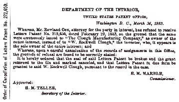 The document attached to the second patent states that the application was "refused...on the ground that the same were erroneously issued to 'The Clough Manufacturing Company' as owner of the entire interest...instead....the inventor...appears as the sole owner of the entire interest.