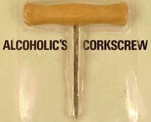 Wirtz, Virginia - Al Coholic goes to his weekly Poker Game every Tuesday. He always brings his trusty corkscrew with him. It is popularly referred to as "Alcoholic's Corkscrew." The mechanism consists of a spike affixed to a wood handle. By driving the spike through the cork in a wine bottle and then extracting it, he is able to insert a small straw so he can sip wine the entire evening.