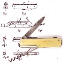 Solingen, Germany, April 18, 1911 - Carl Wilhelm Windhövel and Cuno Weyer have received United States Patent Number 989,680 for their "Pocket Corkscrew." The invention is a combination knife and corkscrew. The advantage they offer is that the worm is concealed when pocketed in a cylinder running the length of the handle. For use the worm is pulled out so a hook at the top stops at the center. The worm is then folded perpendicular to the handle. By attaching the worm in this manner, the "T-handle" corkscrew now has more purchase power on the cork.