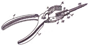 On one of the the jaws he has attached a corkscrew which as he describes "is formed something like a wood screw but is more tapering, is of greater pitch, and is more deeply milled than the ordinary wood screw." He contends the deep milling ensures a stronger pulling hold on the cork.