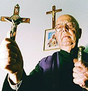 The Rev. Gabriele Amorth with the instruments he uses in an exorcism: a crucifix and a corkscrew.