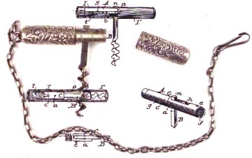 New York, New York, August 21, 1888 - LeRoy Fairchild wrote "This invention relates to that class of corkscrews designed to be carried about the person, the object being to produce a very compact, strong, and neat implement, one that will occupy little space, and can be closed so as to exclude dust and dirt."