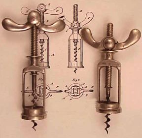 Frankfurt am Main, Germany, August 29, 1899 - Ernst Scharff has patented a locking handle corkscrew design that he is marketing under the name Bodega. With Scharff's corkscrew a cork can be removed in one continuous turning motion of the handle. When the handle is turned to the top of the shaft, the two arms fall to their lowest position. This locks the handle in position so the worm can be fully inserted into the cork. Once the worm is fully inserted, the arms rise "unlocking" the handle which glides down the shaft raising the cork out of the bottle into the frame. The Patent number assigned to Scharff is 113,367.