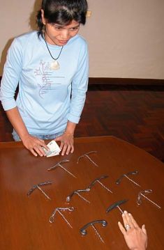 Bangkok, Thailand - Alf and Watcharee Erickson have returned to Bangkok from their New York - Virginia - Florida - London adventure. Watcharee joined The Daily Screw corkscrew Christmas shopping staff and returned to a shop which she found in Bangkok back in September. In the shop was a mother lode of Thai corkscrews. At that time, Alf reported "Watcharee found corkscrews... in a little shop ... tucked down a flight of stairs ... at the end of a long corridor ... in a dark corner ... in a little case. Such beautiful designs! OK, I haven't tried either one ... and maybe the 'nail' on the thicker piece may be more of a pain than a pleasure ... but they are the first two corkscrews that I've found (err ... Watcharee found) that came from the mind of a Thai artist."