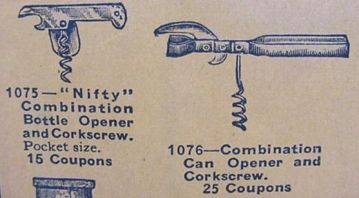 I thought you might be interested in the 1932 -1933 Good as Gold Catalog which offered merchandise for redemption of coupons of United Profit-Sharing Corp. (44 West 18th Street, New York, NY). The coupons were available through purchase of common items such as coffee, tea, flour, salt, soap, etc. Page 20 of the catalog shows a Nifty corkscrew redeemable for 15 coupons and a Can Opener with Corkscrew for 25 coupons.