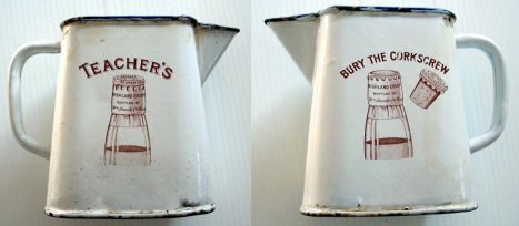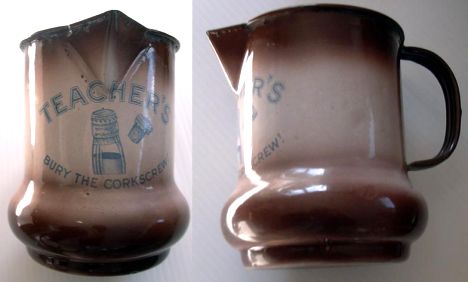 I have attached enclosed photos of enamel steel water jugs with ice catching spouts advertising Teachers Highland Cream Scotch Whisky. Both show a capped or flanged cork in use that eliminate the need of a corkscrew. I think this was first introduced in the 1920's.