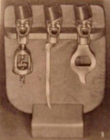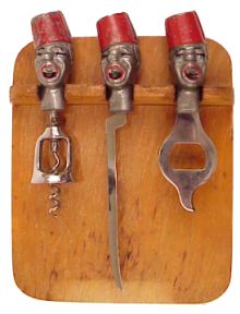 The Shriner Set can also be found on a wood "Z" formed stand. The bottle opener is different and there is an ice pick in place of the knife. Similar sets were produced as bellhops, minstrels, Africans, and gay-nineties bartenders.