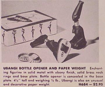 Another 1955 offering was the Ubangi Bottle Opener without a corkscrew. We did not find the example with corkscrew attached to the hair.