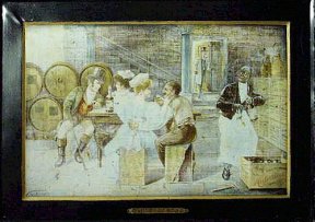 Mississauga, Ontario, Canada - Joe Paradi says "In celebration of Black History Month here is my picture that relates to Blacks and Corkscrews. It is a silk-screened painting on tin 16 " x 22" (40 x 56 cm). The scene is a prohibition era cellar where the black bartender had just pulled the cork from a bottle of booze. He dropped the corkscrew with the cork still on it saying: 'O LORDY DE BOSS' which is the caption under the picture."