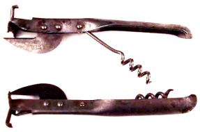 A key element in his patent is the cap remover which is stamped from the metal in the handle portion. It has a folding corkscrew on the underside.
