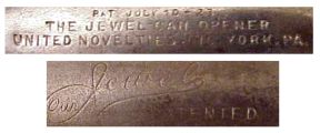 The product is produced by the United Novelty Company of York, Pennsylvania and the handle is marked either "Our Jewel Patented" or "Pat. July 10 - 23, The Jewel Can Opener, United Novelties, Inc., York, Pa.