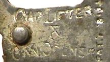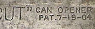 The bar of the handle is marked "SURE-CUT" CAN OPENER PAT. 7-19-04. Two versions of the head can be found. The first like the patent drawing has a slot to slide it onto the bar and it is held in place by one rivet. It is marked CAP LIFTER CAN OPENER. The later version required less bending to manufacturing by eliminating the slot and fastening the head with two rivets. The head was also used on the more common type loop metal handle.