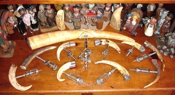 again that he is a premiere hunter of corkscrews and corkscrew information. Not long ago Kenn found an original photograph of corkscrew inventor William Rockwell Clough taken at a 1900 Paris Exhibition. And now the photo above shows some of his wood carved corkscrew figures admiring his latest fabulous find amongst a number of his tusk handle corkscrews.