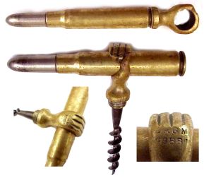 Steinbach-Hallenberg, Germany, July 26, 1898 - G. A. Pfeffer and M. W. Weber have registered a corkscrew design (No. 99881). At the top of the worm is a hand with a hole through the grip. The corkscrew has a bullet shaped sheath which fits in the hole giving the appearance that the hand is gripping the sheath as a handle to pull a cork.