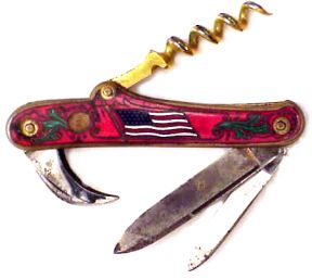 The corkscrew knife depicting the American Flag was produced in Solingen, Germany and imported by the New York firm A. Kastor & Bros.