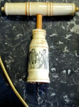 Hand Carved Bone Scrimshaw Corkscrew: This is such a unique item! Grand 20th century bone scrimshaw corkscrew. Detailed handcrafted scene (please see pics). Each side of the handled unscrews, one side reveals a bottle opener, the other a brush. My pictures capture the find craftmanship of this unique item!