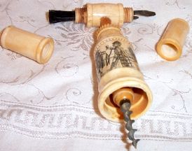 Castle Antiques and Reproductions of Hawley, Pennsylvania currently offers several of the "bone" carved corkscrews shown in recent issues of The Daily Screw. The Chef and Top Hat man are $50.00 each. Two Barrel Type corkscrews - one picturing a group of men and the other a horse and buggy are $75.00 each. They do state that their items are "manufactured originals or reproductions and are sold as such" and that "They are not old or antiques."