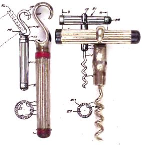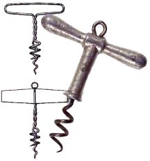 Brooklyn, New York, June 27, 1876 - Joshua Barnes has been granted United States Patent Number 179,090 for his "Improvement in Corkscrews." It is a well-known that there are a great variety of cork sizes in bottles. Wines and beers are sealed with a fairly large cork compared to those use for medicines, inks, perfumes, and the like. Barnes idea is to make on device that can pull a variety of cork sizes. To accomplish this he suggests two pieces of wire mounted in his handle. The longer piece has a longer , slender spiral for pulling small corks. The shorter wire is larger and more stout for pulling larger corks. In removing larger corks, the smaller wire is inserted and turned into the cork and when the second wire is reached, the user continues to turn it until seated far enough for a healthy pull.
