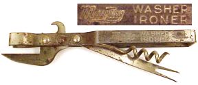 Wirtz, Virginia - Editor's note: The can opener, cap lifter, corkscrew has an unusual addition of a cocktail fork. It is an odd place for an advertisement for a Maytag Washer-Ironer. The Maytag Company was not related to Briggs. Maytag was founded in 1893 as a farm implement manufacturer and did not produce a washing machine until 1911.