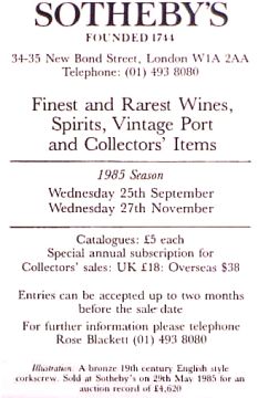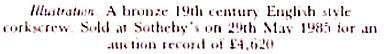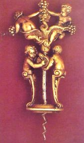 A Cherubs was offered in the May 1999 semi-annual corkscrew sale at Christie's in London. It was described as "A fine large ormolu* figural corkscrew, with sliding frame, the handle formed as two putti, harvesting grapes, the pillars as two putti caryatids, one holding a central barrel, the other pouring a glass of wine, centre worm." The description also referred to the 1985 Sotheby's catalog cover. It may have been the same one but the owner had since shined it up. It brought £4,620. At that time the pound was worth $1.60 translating the selling price to $7392.