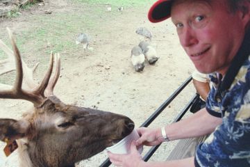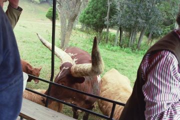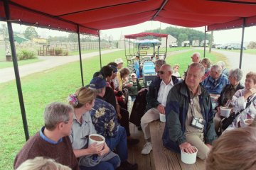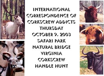 Natural Bridge, Virginia - On October 9 the International Correspondence of Corkscrew Addicts went hunting for corkscrew handles. Their search started when they hopped on the a cart pulled by a tractor. Each member was given a bucket of food to entice the horny animals to come for a close-up.