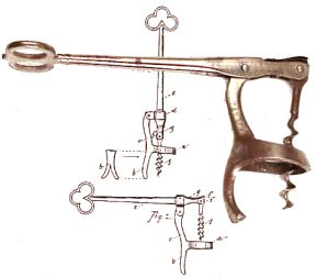 Hartford, Connecticut, September 3, 1878 - William W. Tucker has patented his "Improvement in Cork-Extractors." Tucker says to use his corkscrew, you start with the handle in the vertical position, then you turn the whole assembly to screw the worm into the cork. Once the ring meets the bottle neck, the foot engages the side of the bottle. to hold the device steady. The handle is then pulled down and the cork is extracted.