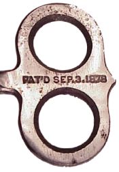 The patent shows a handle with three "holes" as in the patent model shown above left. The produciton model has two holes and is marked with the patent date between the holes.