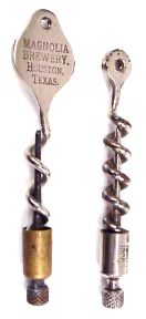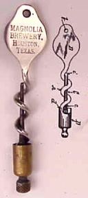 Although the Walker patent drawing shows a corkscrew for a right-handed person, the corkscrews were produced for both lefthanders and righthanders. Those in our pictures are for lefties.