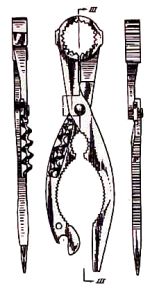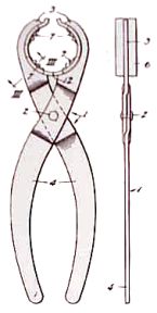 The 1954 design patent depicted a more robust gripper with the grips cast into the tool. Ice hammers / crackers were added to the outside of the jaws. In the above photo we see from left to right: The first patent, a chrome plated cast version, a gold plated cast version, and a Made in Japan cast knockoff.